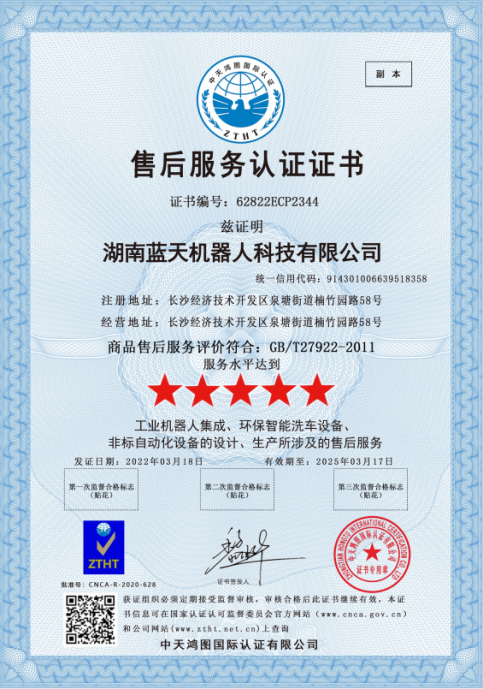 為了更好的服務市場,我們藍天機器人不懈努力,成功通過“五星級”服務水平商品售后服務評價體系認證。此次認證,是藍天機器人完善的售后服務體系及品牌實力的體現。